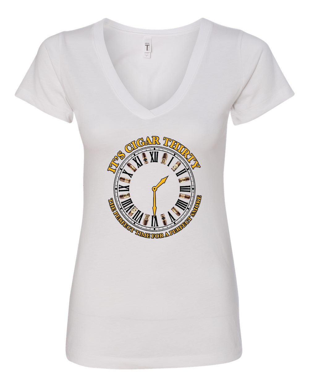 IT'S CIGAR THIRTY WOMEN'S WHITE WITH GOLD V-NECK T-SHIRT